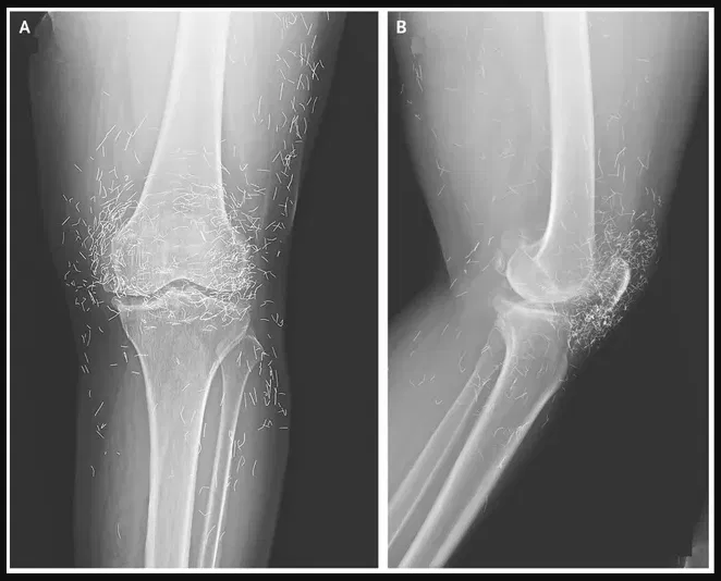 Doctors examining X-rays of a 65-year-old South Korean woman with severe knee pain made a startling discovery: hundreds of tiny gold acupuncture needles embedded in her tissue.
