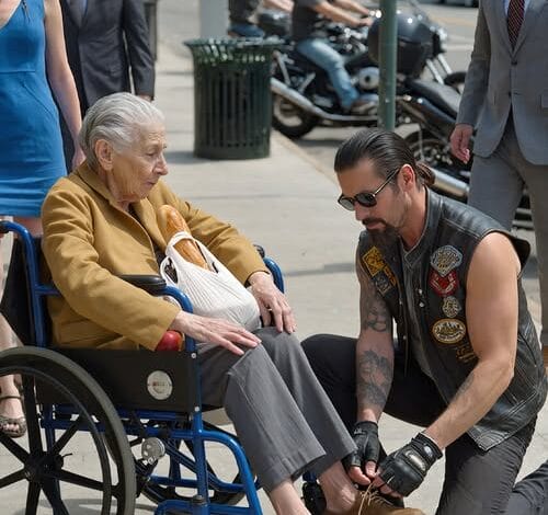 It was a man in a leather vest, tattoos down his arms, gloves worn from riding. He knelt on the pavement—not hurried, not annoyed—and tied my shoes with the care of someone handling silk.