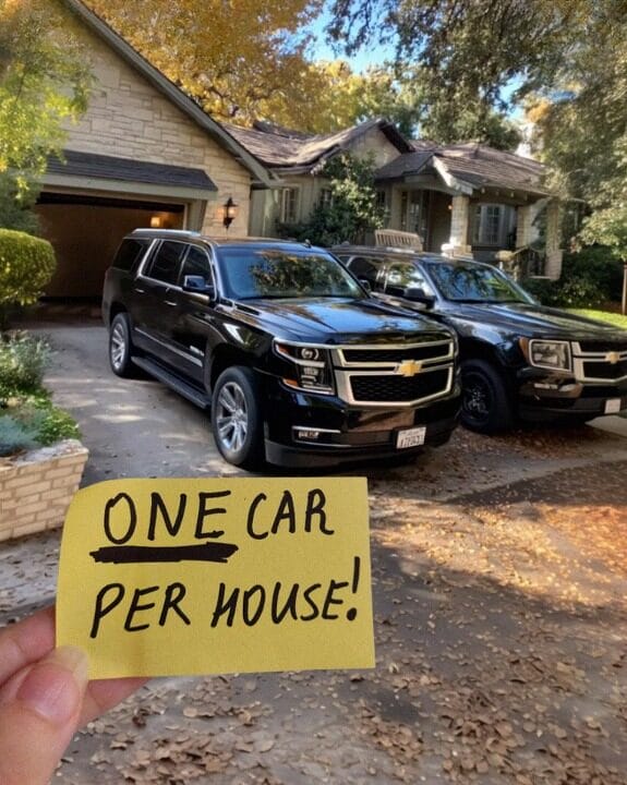“Our HOA—very friendly, but firm—has a rule about cars,” she said. “Only one per household in the driveway.”