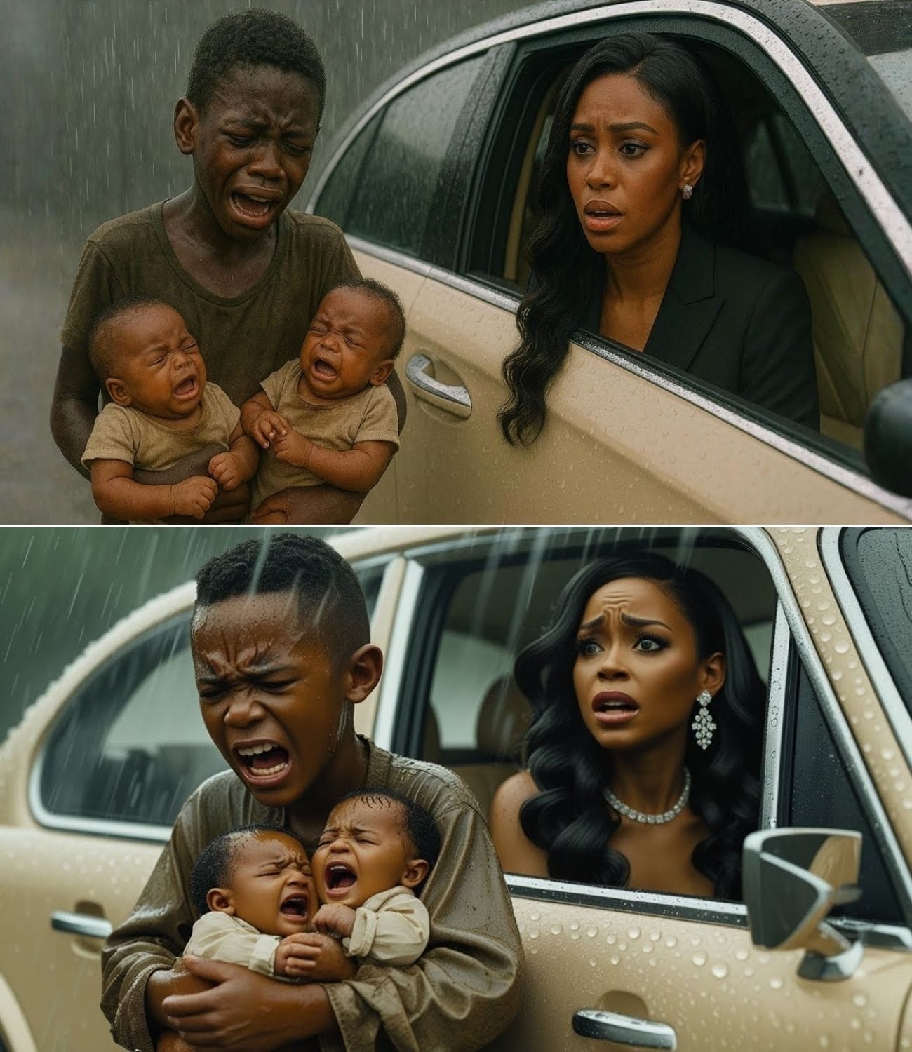 The boy was clearly lying about something, or maybe everything, but the way he cradled the twins, it didn’t feel like a trick. He didn’t ask for money. He didn’t stretch his hand. He didn’t even move. Amora took a deep breath and looked back at her car. The wipers were still moving. Caru was still holding the umbrella behind her. She turned to him. Bring them in. Ma.