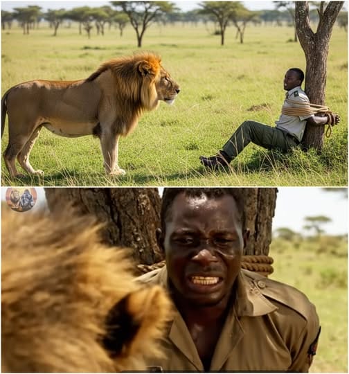 The lion shifted its weight, its gaze moving from Alex’s face to the tight knots around his torso. With a gentle lowering of its immense head, the coarse mane brushed against the dry grass. A low rumble vibrated in its chest, a sound Alex recognized as acknowledgment rather than aggression. The lion cautiously extended its snout, nudging the rope, then pulled back, seemingly contemplating the complexity of the knots.