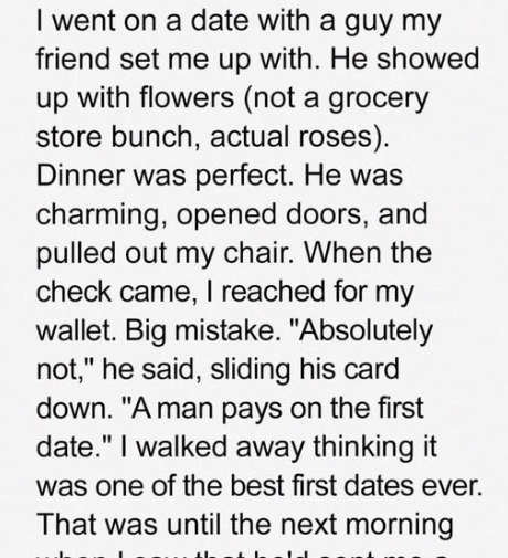 That morning, he sent me an email that made my phone ring. I smiled because I thought I would get a good message. Instead, I got a carefully put together bill. He had added up the costs of dinner, flowers, the “personalized gift,” and something he called “emotional effort owed.” At the bottom, he wrote a letter that made it sound like I owed him “reciprocation” in the form of more dates, or else he would tell his friend Chris that I was ungrateful. The pleasant man from last night suddenly looked a lot more like a red flag.