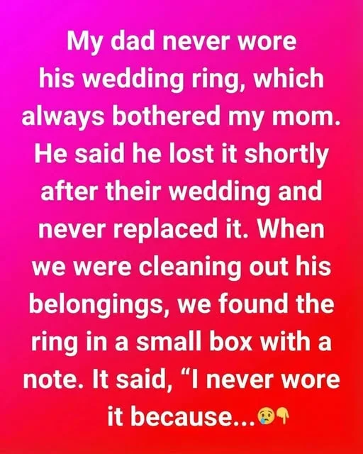 For years, my dad had told a simple story about that ring. He said he had lost it not long after the wedding. Life moved on quickly after that—work, children, responsibilities, routines. No one ever pushed the subject. My mom accepted the explanation, but like many quiet truths, it lingered in the background. Not as resentment. Not as accusation. Just as a gentle, unanswered question.